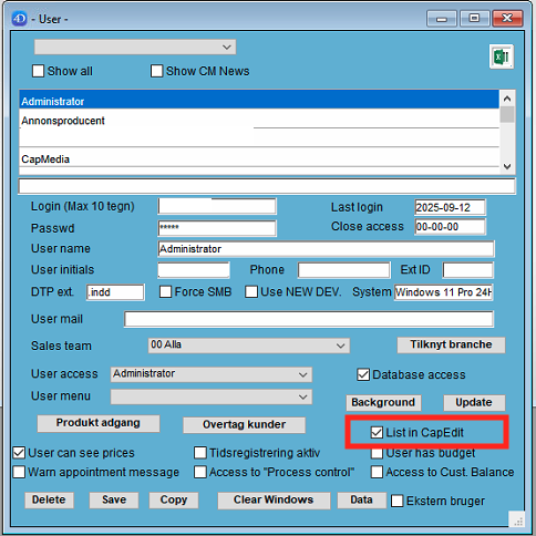 Välj i listan den användare Du vill ta bort från listan i CapEdit och klicka sedan ur rutan framför "List in CapEdit"